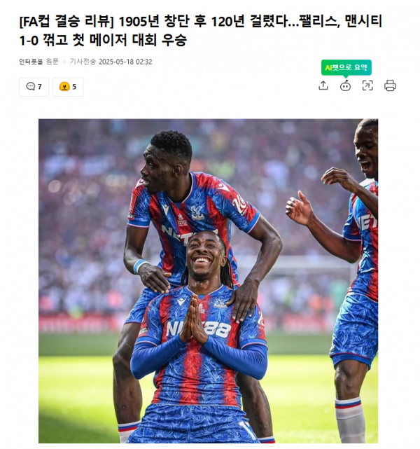 팰리스는18일 오전 0시 30분(한국시간) 영국 런던에 위치한 웸블리 스타디움에서 열린 2024-25시즌 잉글랜드 FA컵 결승에서 맨체스터 시티에 1-0 승리를 거뒀다.1905년 창단한 팰리스는 잉글랜드 챔피언십(2부리그), 리그원(3부리그)에서 우승한 적은 있지만 메이저 대에선 우승을 못했다. 창단 120년 만에 첫 메이저 대회 트로피를 들었다.