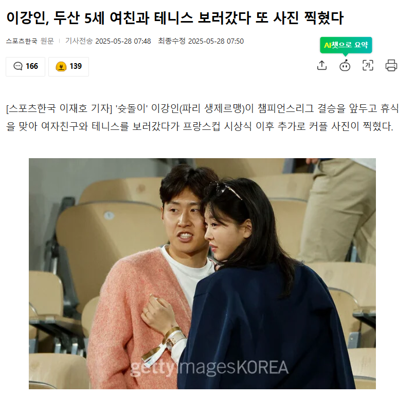 지난 27일(이하 현지시간) 이강인은 프랑스 파리에서 열리고 있는 세계 최고의 테니스 대회인 롤랑가르스 2025을 보러갔다가 관중석에서 사진이 찍혔다.