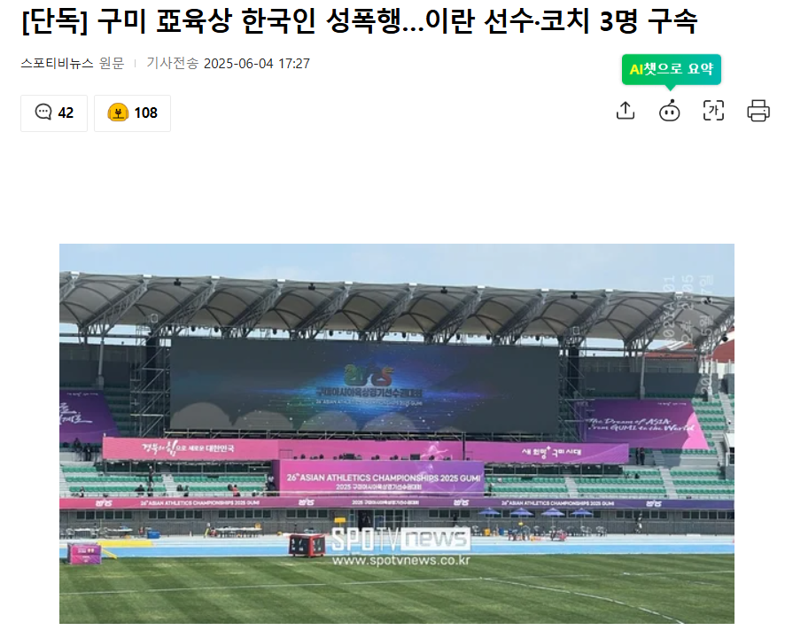 경찰 등에 따르면 지난 31일 오전 경북 구미의 한 호텔에서 20대 한국인 여성이 이란 육상선수 등에게 성폭행당했다는 신고가 접수됐고, 경찰이 현장에서 30대 이란 육상선수 2명과 코치 1명을 현행범으로 체포했다.